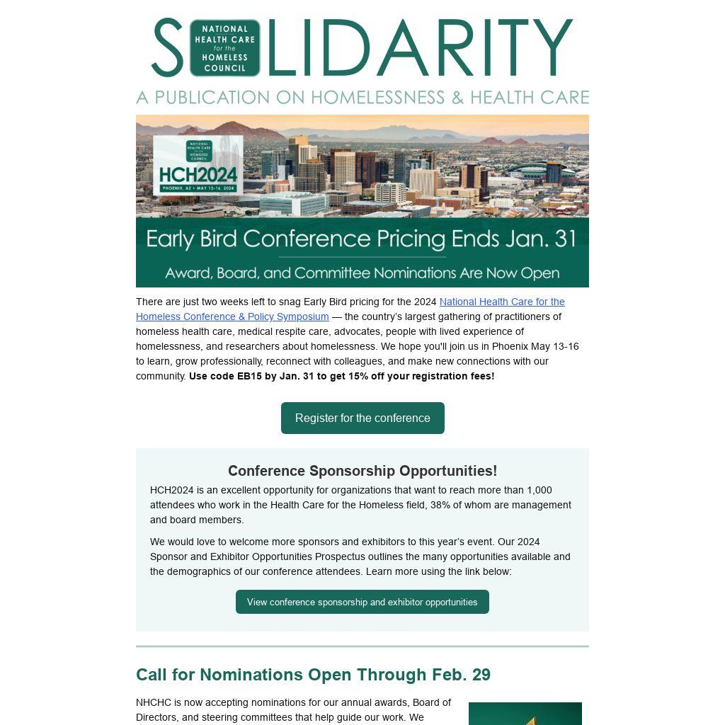 There are just two weeks left to snag Early Bird pricing for the 2024 National Health Care for the Homeless Conference & Policy Symposium — the country’s largest gathering of practitioners of homeless health care, medical respite care, advocates, people with lived experience of homelessness, and researchers about homelessness. We hope you'll join us in Phoenix May 13-16 to learn, grow professionally, reconnect with colleagues, and make new connections with our community. Use code EB15 by Jan. 31 to get 15% off your registration fees!