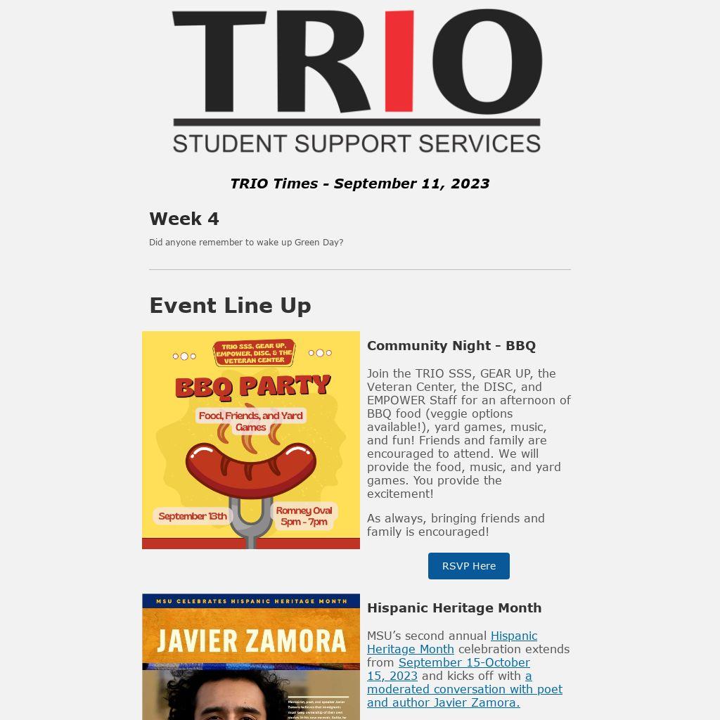 Join the TRIO SSS, GEAR UP, the Veteran Center, the DISC, and EMPOWER Staff for an afternoon of BBQ food (veggie options available!), yard games, music, and fun! Friends and family are encouraged to attend. We will provide the food, music, and yard games. You provide the excitement!