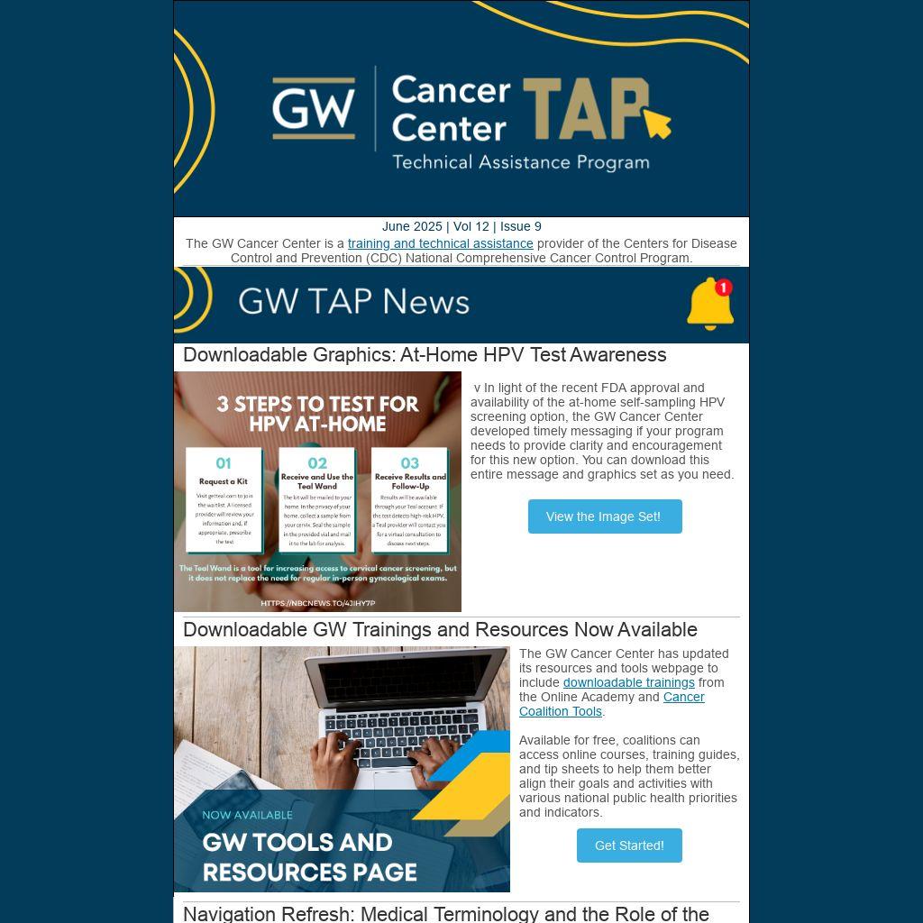 v In light of the recent FDA approval and availability of the at-home self-sampling HPV screening option, the GW Cancer Center developed timely messaging if your program needs to provide clarity and encouragement for this new option. You can download this entire message and graphics set as you need.