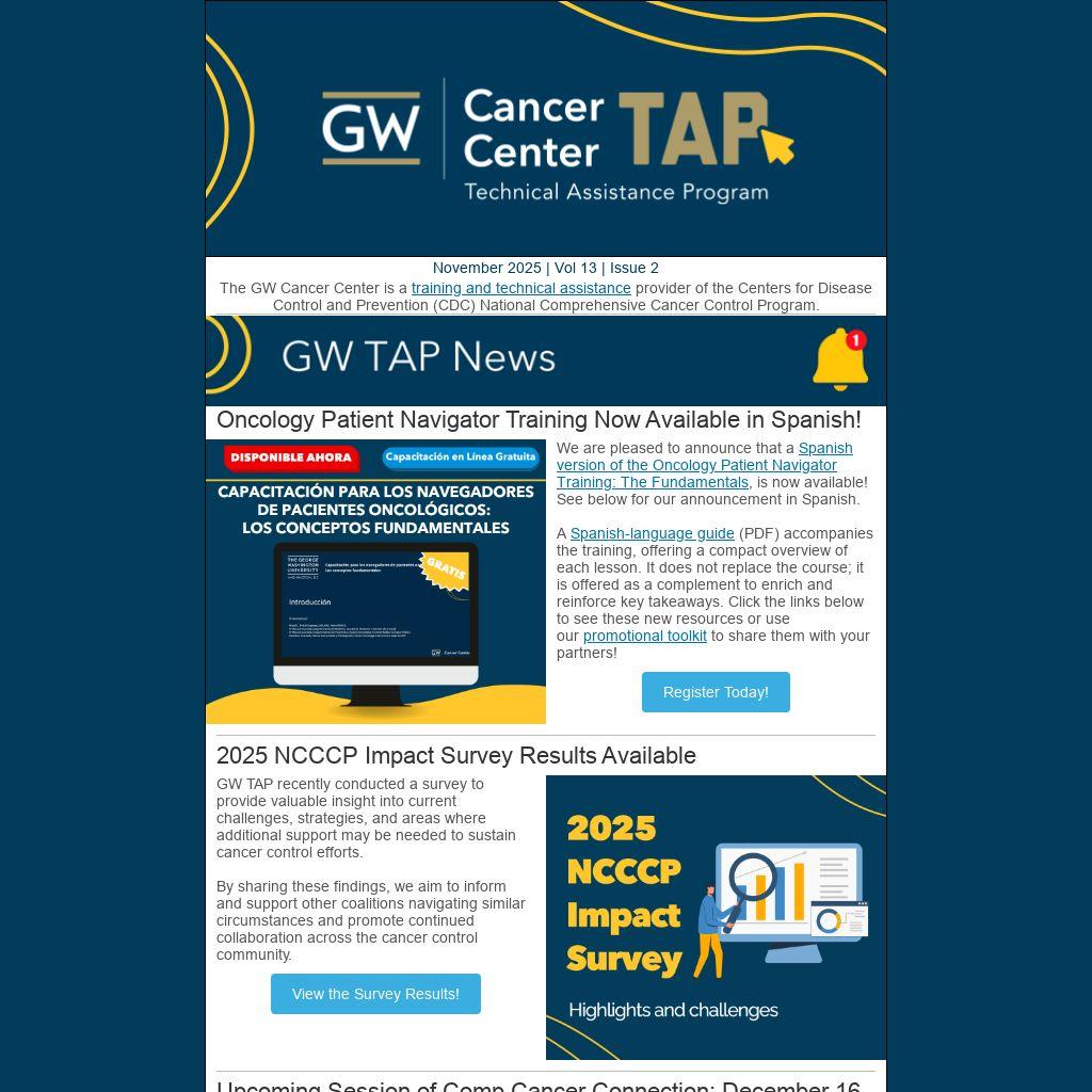 The GW Cancer Center is a training and technical assistance provider of the Centers for Disease Control and Prevention (CDC) National Comprehensive Cancer Control Program.