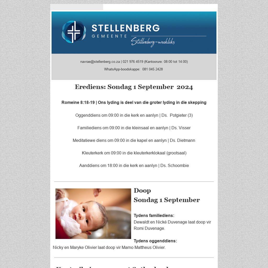 Jy kan gemeentenuus weekliks deur middel van die Stellenberg-weekliks per e-pos ontvang. Stuur jou e-posadres aan sanel@stellenberg.co.za. - Op jou selfoon: