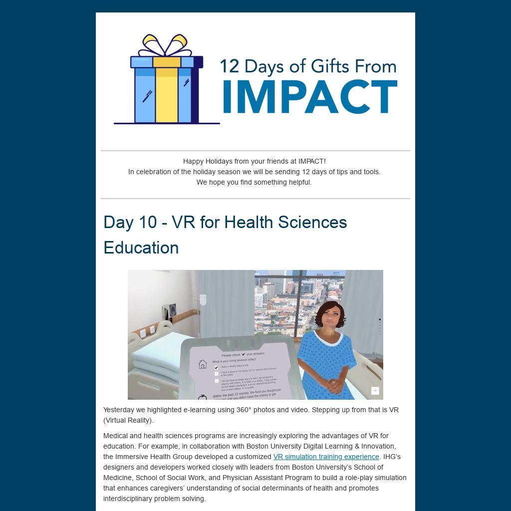 Happy Holidays from your friends at IMPACT! In celebration of the holiday season we will be sending 12 days of tips and tools. We hope you find something helpful.