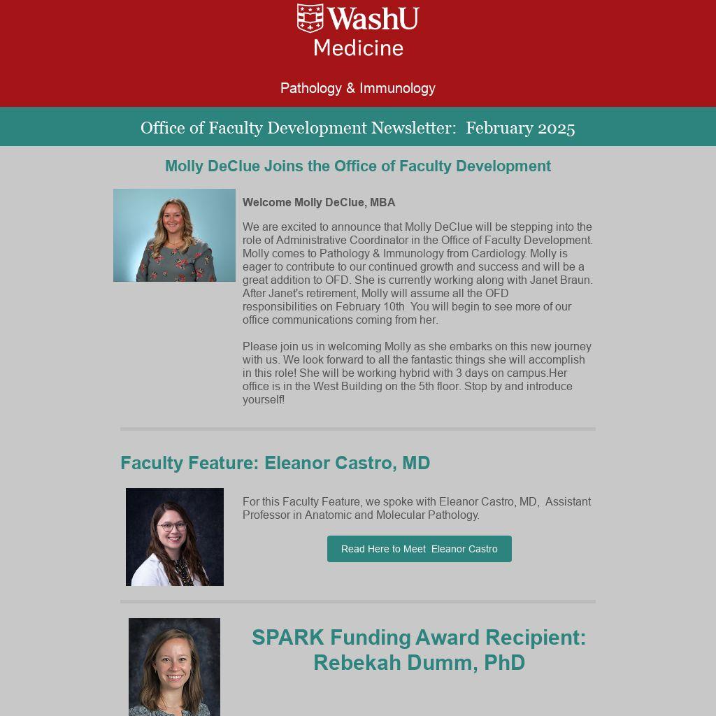 We are excited to announce that Molly DeClue will be stepping into the role of Administrative Coordinator in the Office of Faculty Development. Molly comes to Pathology & Immunology from Cardiology. Molly is eager to contribute to our continued growth and success and will be a great addition to OFD. She is currently working along with Janet Braun. After Janet's retirement, Molly will assume all the OFD responsibilities on February 10th You will begin to see more of our office communications coming from her.