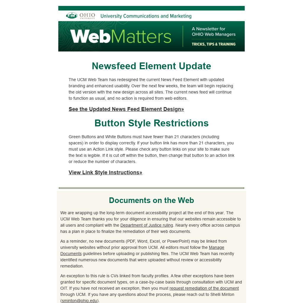 As a reminder, no new documents (PDF, Word, Excel, or PowerPoint) may be linked from university websites without prior approval from UCM. All editors must follow the