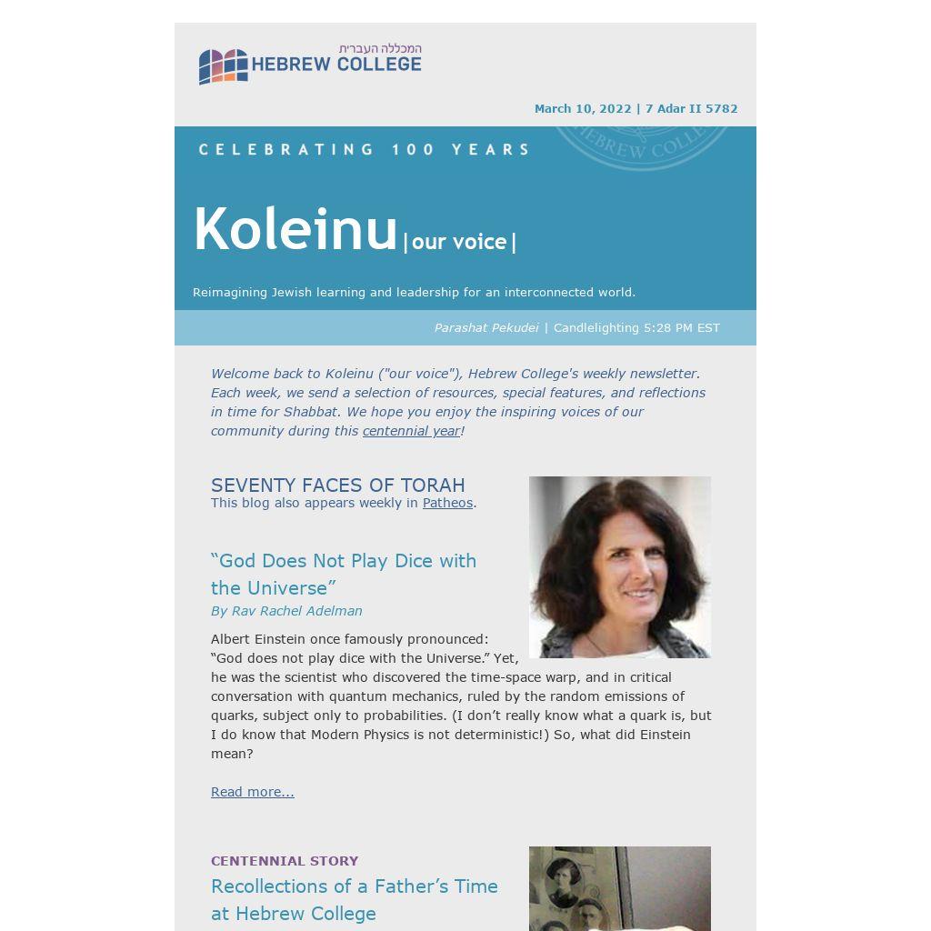 Welcome back to Koleinu ("our voice"), Hebrew College's weekly newsletter. Each week, we send a selection of resources, special features, and reflections in time for Shabbat. We hope you enjoy the inspiring voices of our community during this centennial year!