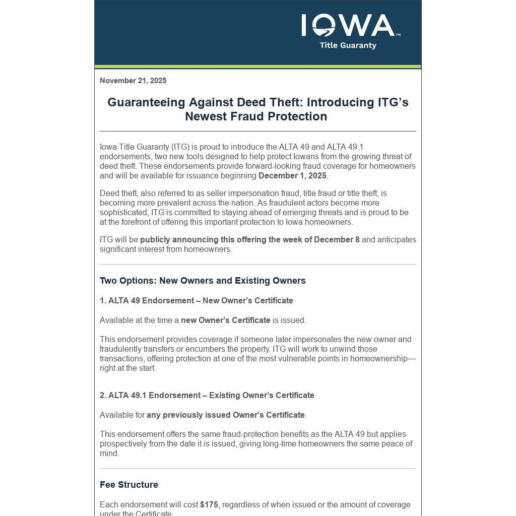 Iowa Title Guaranty (ITG) is proud to introduce the ALTA 49 and ALTA 49.1 endorsements, two new tools designed to help protect Iowans from the growing threat of deed theft. These endorsements provide forward-looking fraud coverage for homeowners and will be available for issuance beginning December 1, 2025.