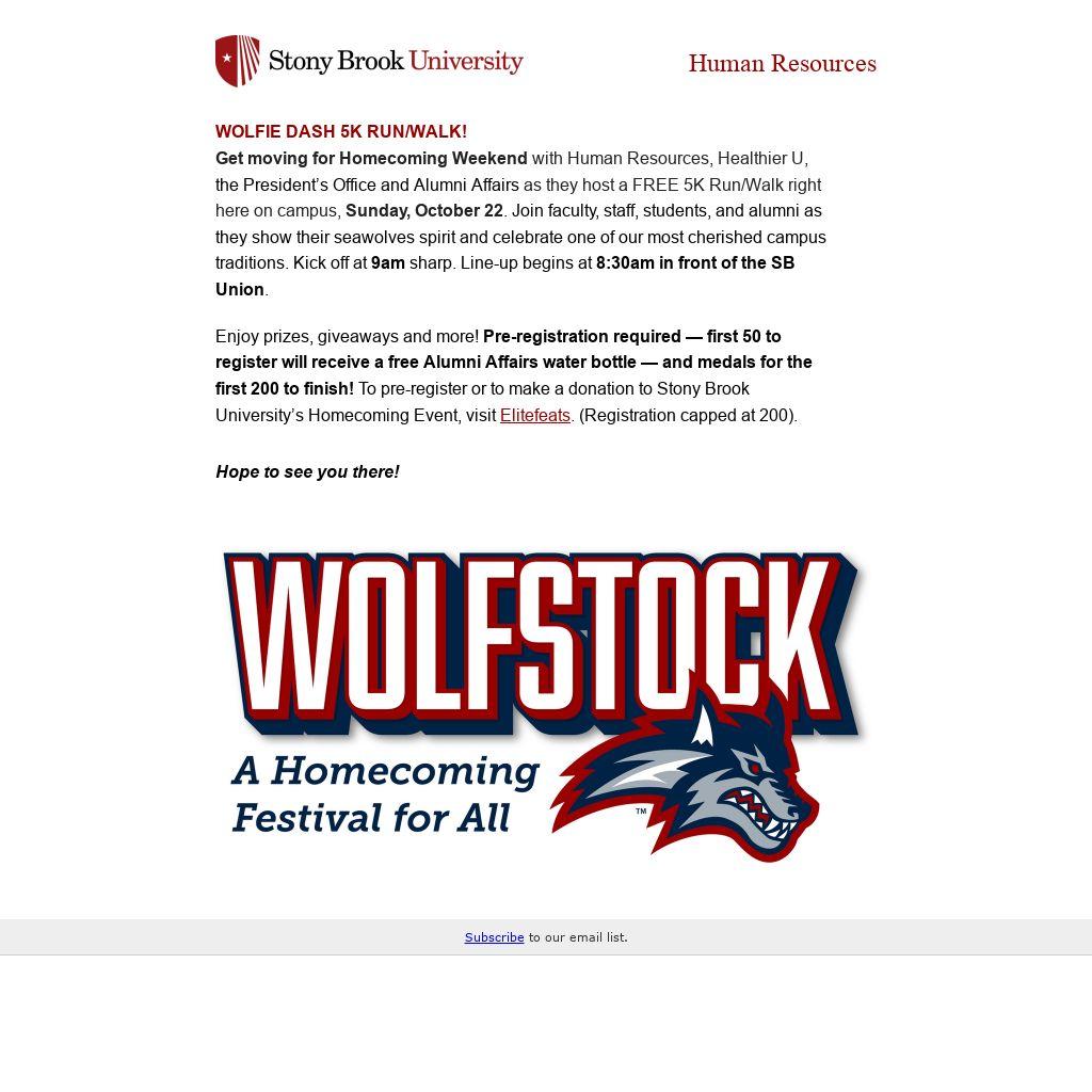 Get moving for Homecoming Weekend with Human Resources, Healthier U, the President’s Office and Alumni Affairs as they host a FREE 5K Run/Walk right here on campus, Sunday, October 22. Join faculty, staff, students, and alumni as they show their seawolves spirit and celebrate one of our most cherished campus traditions. Kick off at 9am sharp. Line-up begins at 8:30am in front of the SB Union.