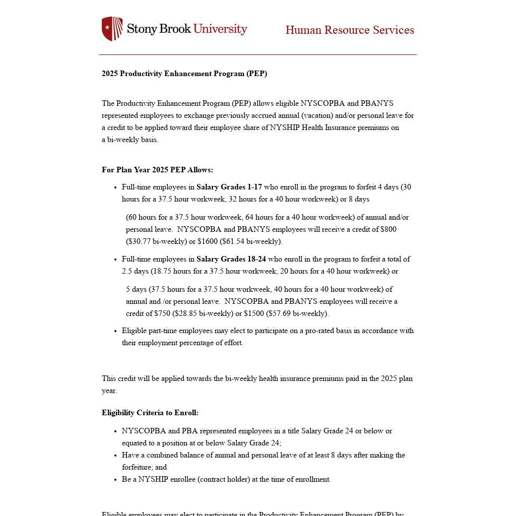 The Productivity Enhancement Program (PEP) allows eligible NYSCOPBA and PBANYS represented employees to exchange previously accrued annual (vacation) and/or personal leave for a credit to be applied toward their employee share of NYSHIP Health Insurance premiums on a bi-weekly basis.