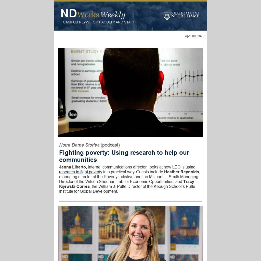 Jenna Liberto, internal communications director, looks at how LEO is using research to fight poverty in a practical way. Guests include Heather Reynolds, managing director of the Poverty Initiative and the Michael L. Smith Managing Director of the Wilson Sheehan Lab for Economic Opportunities, and Tracy Kijewski-Correa, the William J. Pulte Director of the Keough School’s Pulte Institute for Global Development.