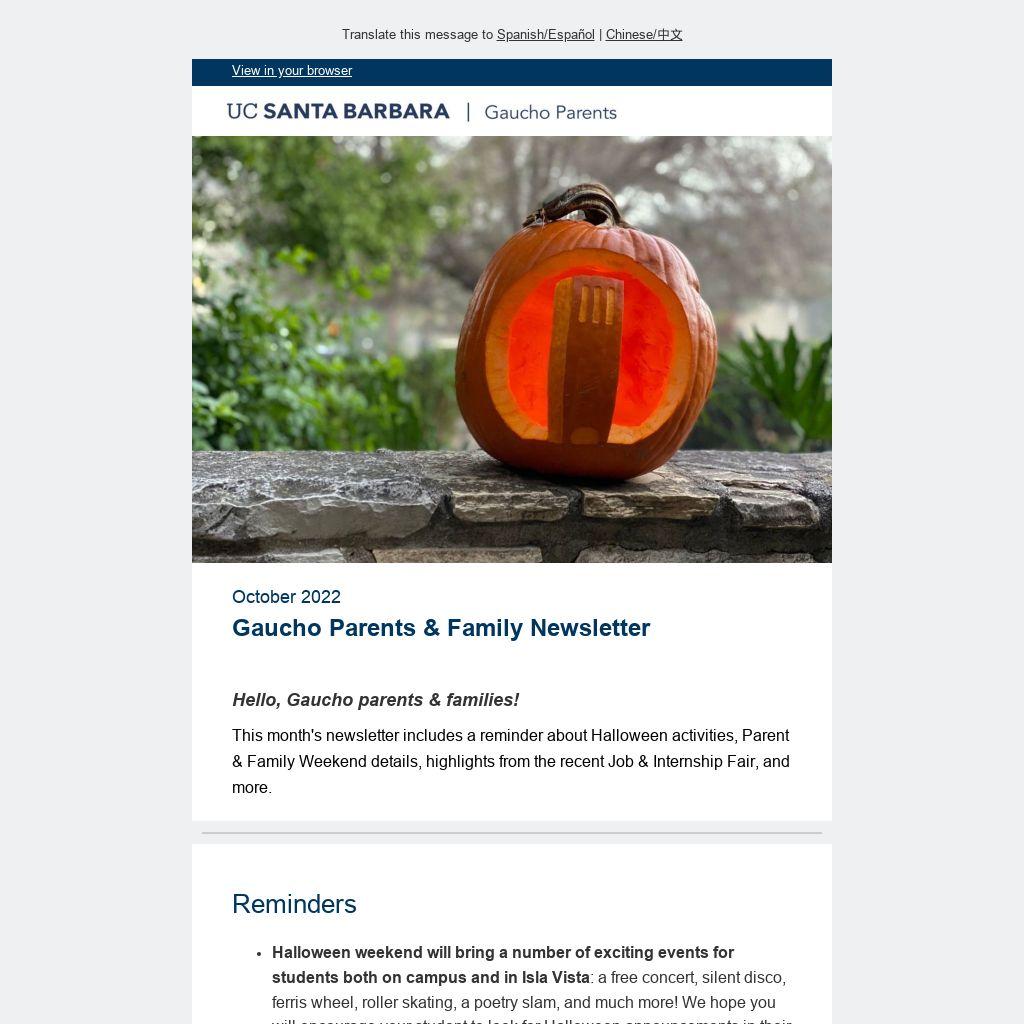 Get the full UC Santa Barbara experience during Parents & Family Weekend. Registration and ticket sales close on October 31st! Spend time with your Gaucho, meet other families and see what UCSB's all about.