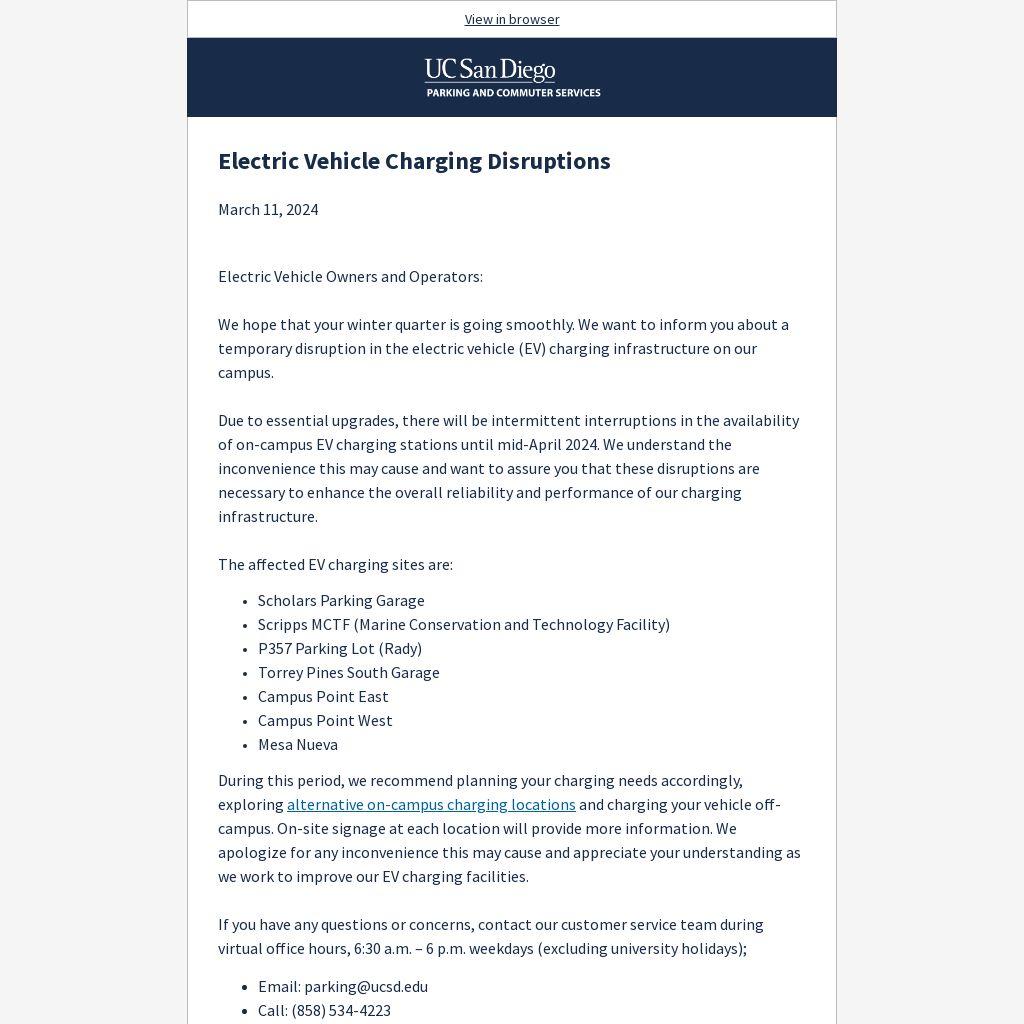 We hope that your winter quarter is going smoothly. We want to inform you about a temporary disruption in the electric vehicle (EV) charging infrastructure on our campus.