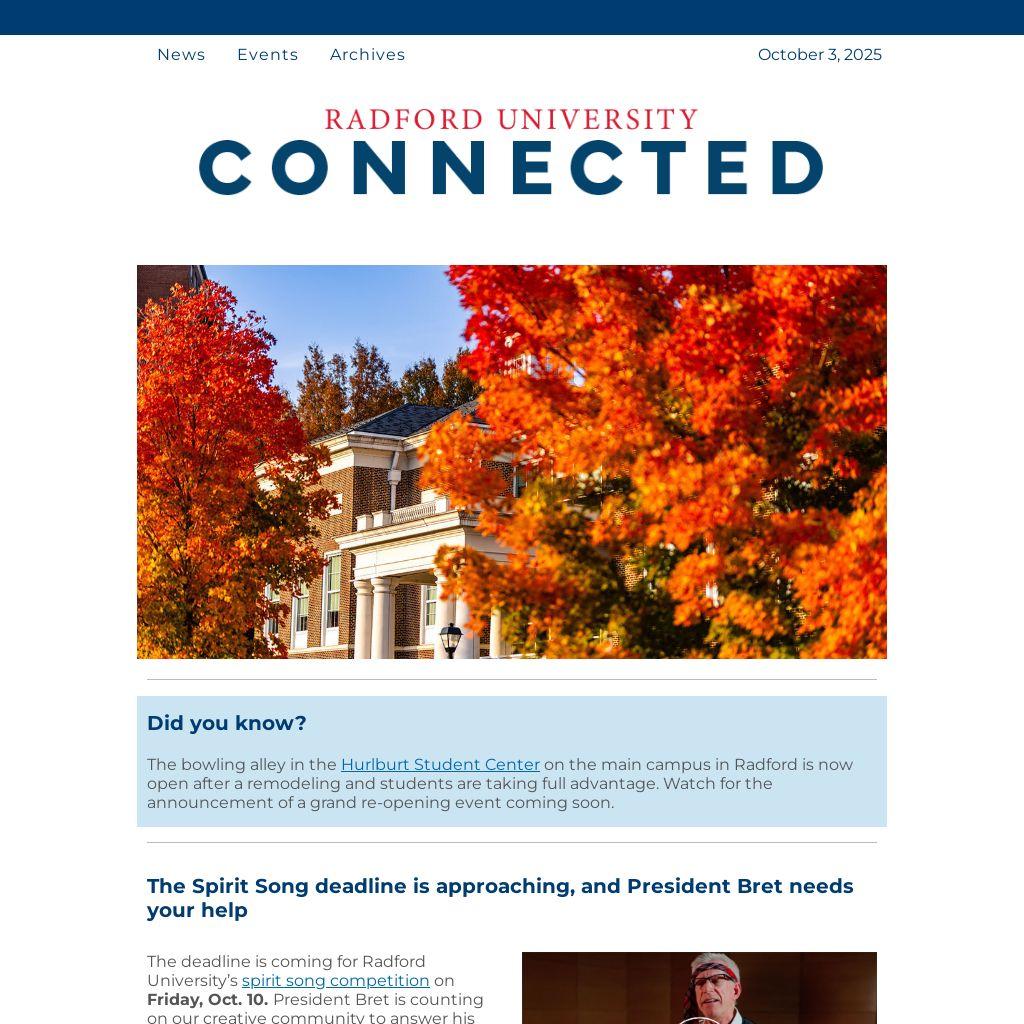 The deadline is coming for Radford University’s spirit song competition on Friday, Oct. 10. President Bret is counting on our creative community to answer his call. Watch his video to see his appeal for help crafting an anthem for our Highlander family.