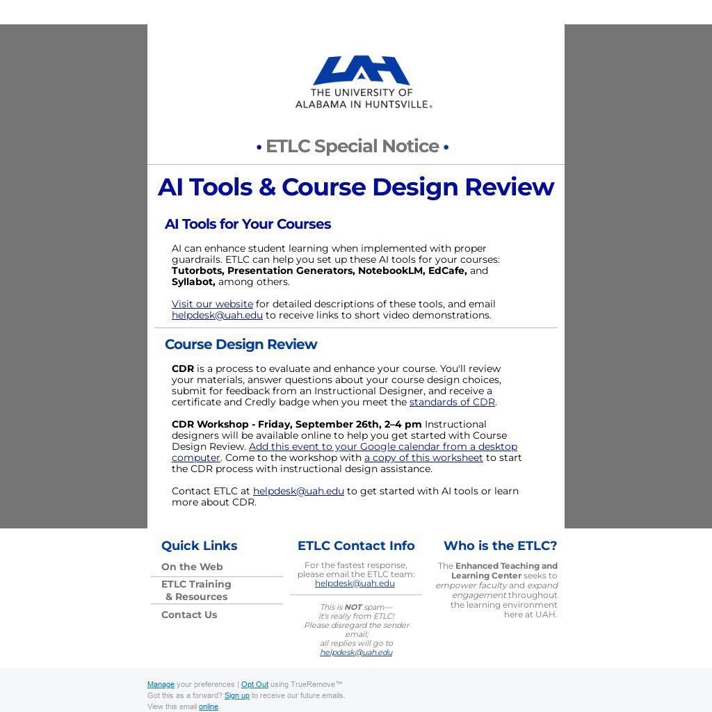 Contact ETLC at helpdesk@uah.edu to get started with AI tools or learn more about CDR.