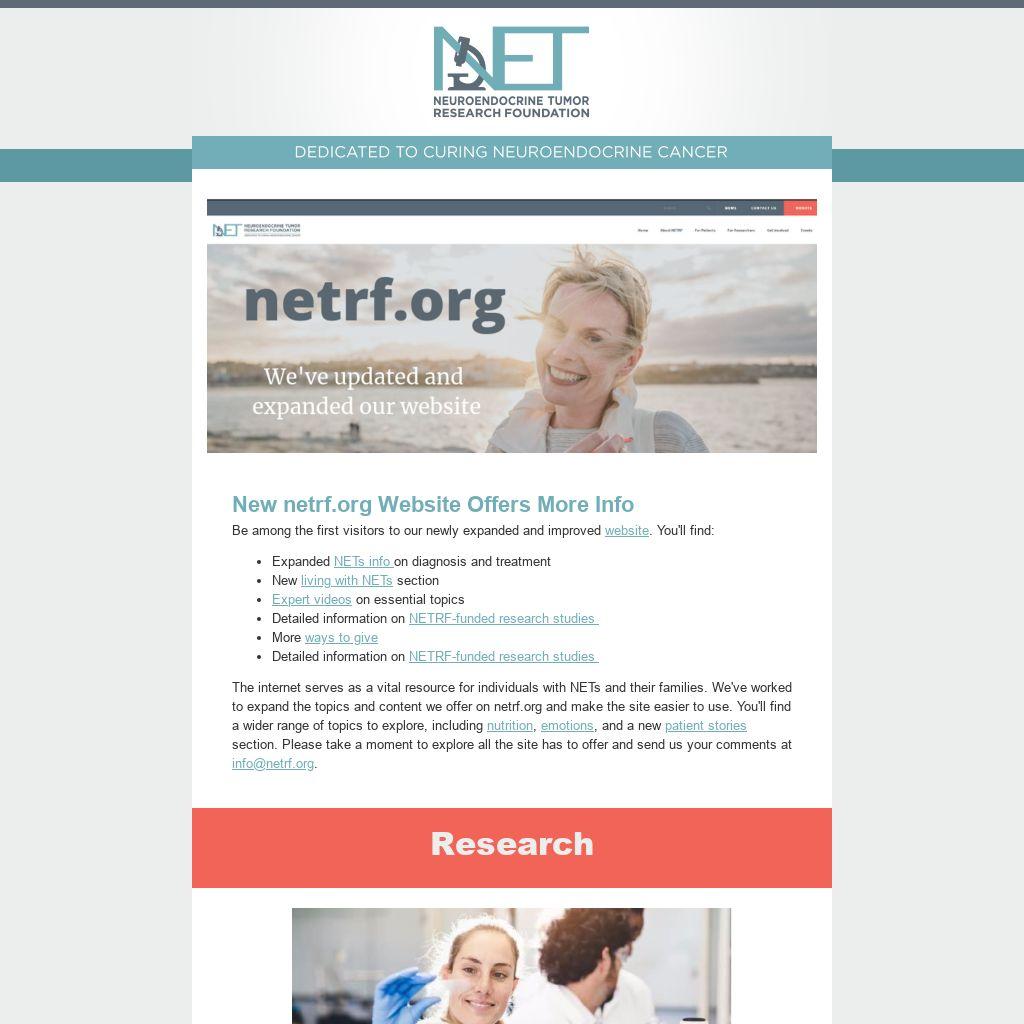 The internet serves as a vital resource for individuals with NETs and their families. We've worked to expand the topics and content we offer on netrf.org and make the site easier to use. You'll find a wider range of topics to explore, including nutrition, emotions, and a new patient stories section. Please take a moment to explore all the site has to offer and send us your comments at info@netrf.org.