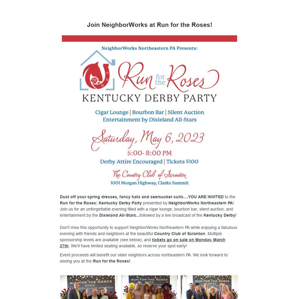 Dust off your spring dresses, fancy hats and seersucker suits....YOU ARE INVITED to the Run for the Roses: Kentucky Derby Party presented by NeighborWorks Northeastern PA! Join us for an unforgettable evening filled with a cigar lounge, bourbon bar, silent auction, and entertainment by the Dixieland All-Stars...followed by a live broadcast of the Kentucky Derby!