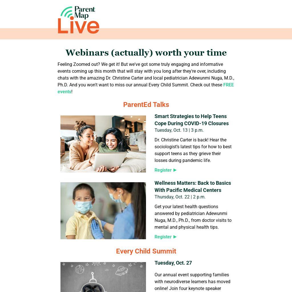 Feeling Zoomed out? We get it! But we've got some truly engaging and informative events coming up this month that will stay with you long after they're over, including chats with the amazing Dr. Christine Carter and local pediatrician Adewunmi Nuga, M.D., Ph.D. And you won't want to miss our annual Every Child Summit. Check out these