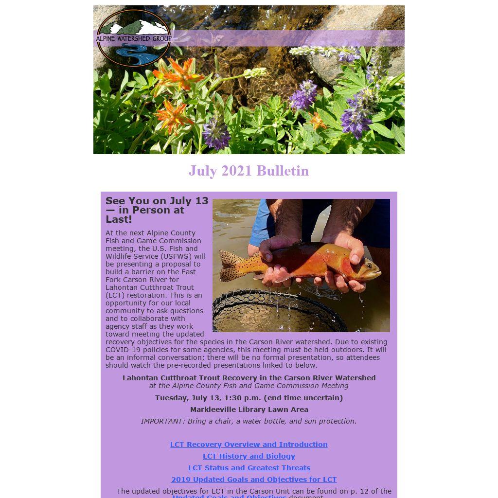 Given that this important meeting falls on AWG's July meeting date, and there is the opportunity to once more meet in person, AWG's July meeting will be an informal gathering directly following the USFWS presentation. We plan to walk to Markleeville Creek at Heritage Park to take a look at Caltrans' progress on replacing the Markleeville Bridge on Highway 89, and we will talk about the future Markleeville Creek Restoration Project. We'll have lemonade and cookies. We are so excited to see everyone again!