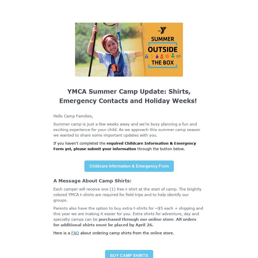 Each camper will receive one (1) free t-shirt at the start of camp. The brightly colored YMCA t-shirts are required for field trips and to help identify our groups.