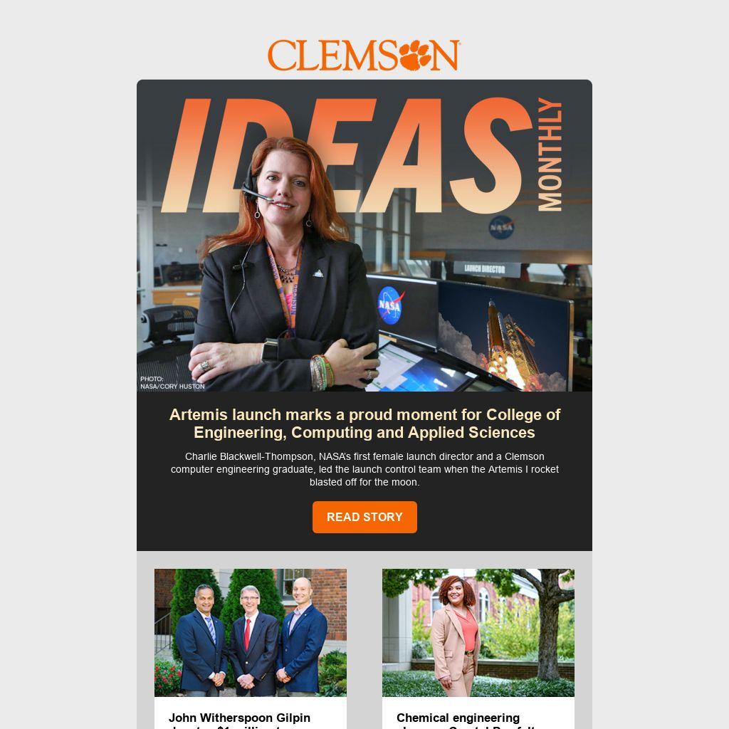 IDEAS Monthly is published by the PROMO Office in Clemson University’s College of Engineering, Computing and Applied Sciences. Contact the team with feedback or story suggestions.