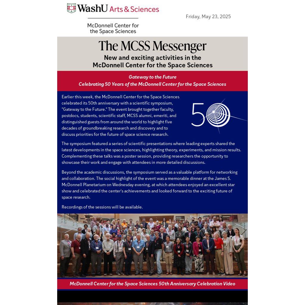 Earlier this week, the McDonnell Center for the Space Sciences celebrated its 50th anniversary with a scientific symposium, "Gateway to the Future." The event brought together faculty, postdocs, students, scientific staff, MCSS alumni, emeriti, and distinguished guests from around the world to highlight five decades of groundbreaking research and discovery and to discuss priorities for the future of space science research.