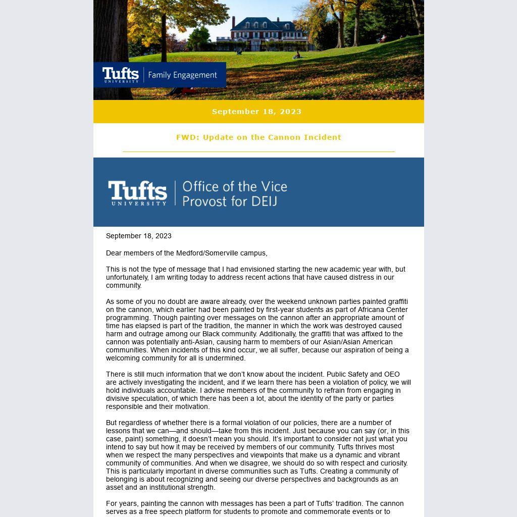 But regardless of whether there is a formal violation of our policies, there are a number of lessons that we can—and should—take from this incident. Just because you can say (or, in this case, paint) something, it doesn’t mean you should. It’s important to consider not just what you intend to say but how it may be received by members of our community. Tufts thrives most when we respect the many perspectives and viewpoints that make us a dynamic and vibrant community of communities. And when we disagree, we should do so with respect and curiosity. This is particularly important in diverse communities such as Tufts. Creating a community of belonging is about recognizing and seeing our diverse perspectives and backgrounds as an asset and an institutional strength.