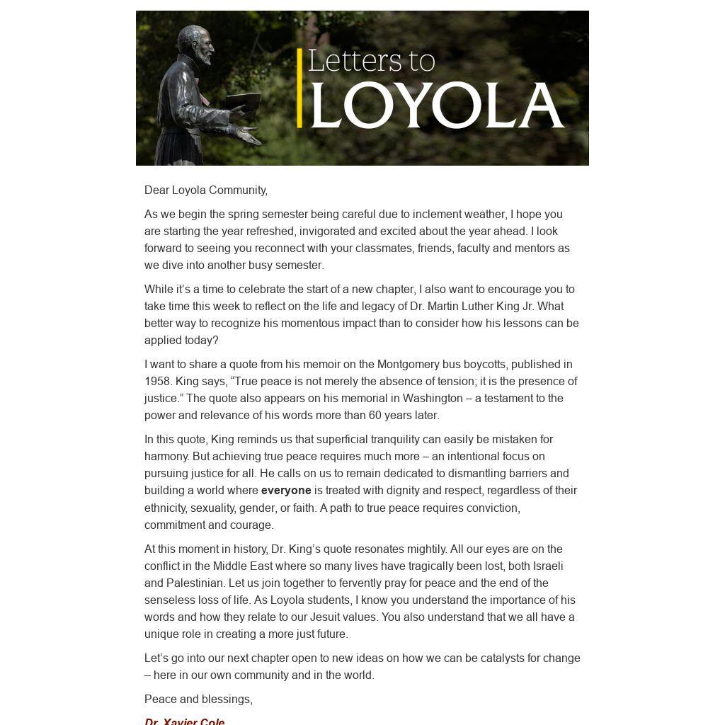 At this moment in history, Dr. King’s quote resonates mightily. All our eyes are on the conflict in the Middle East where so many lives have tragically been lost, both Israeli and Palestinian. Let us join together to fervently pray for peace and the end of the senseless loss of life. As Loyola students, I know you understand the importance of his words and how they relate to our Jesuit values. You also understand that we all have a unique role in creating a more just future.