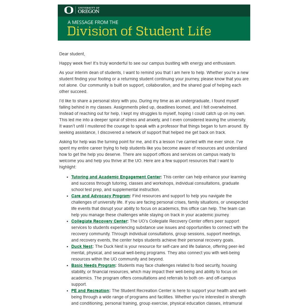 Asking for help was the turning point for me, and it’s a lesson I’ve carried with me ever since. I’ve spent my entire career trying to help students like you become aware of resources and understand how to get the help you deserve. There are support offices and services on campus ready to welcome you and help you thrive at the UO. Here are a few support resources that I want to highlight:
