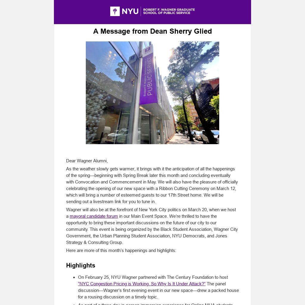 We will continue to post these bulletins on Wagner’s website. If you have any questions about anything in these monthly bulletins, please contact NYU Wagner Chief of Staff, Christina Powell.