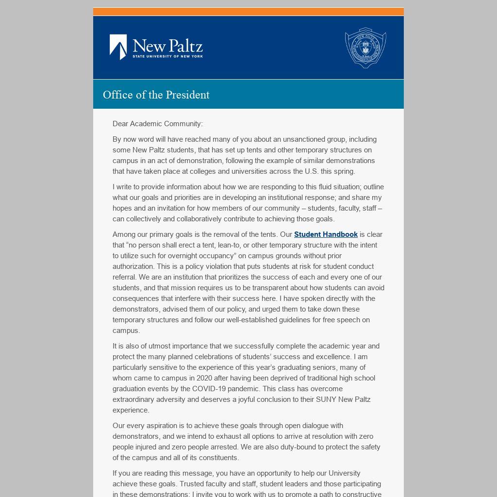 By now word will have reached many of you about an unsanctioned group, including some New Paltz students, that has set up tents and other temporary structures on campus in an act of demonstration, following the example of similar demonstrations that have taken place at colleges and universities across the U.S. this spring.