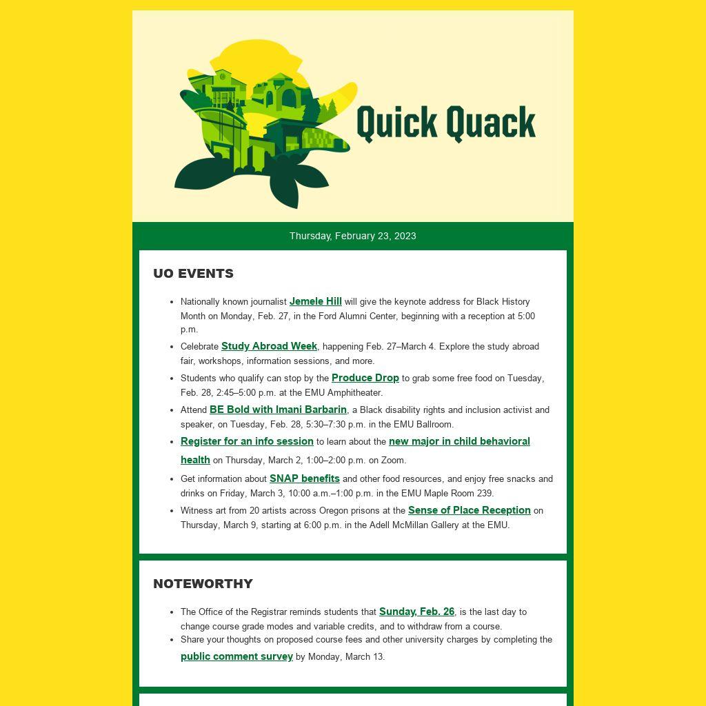 - The Office of the Registrar reminds students that Sunday, Feb. 26, is the last day to change course grade modes and variable credits, and to withdraw from a course.