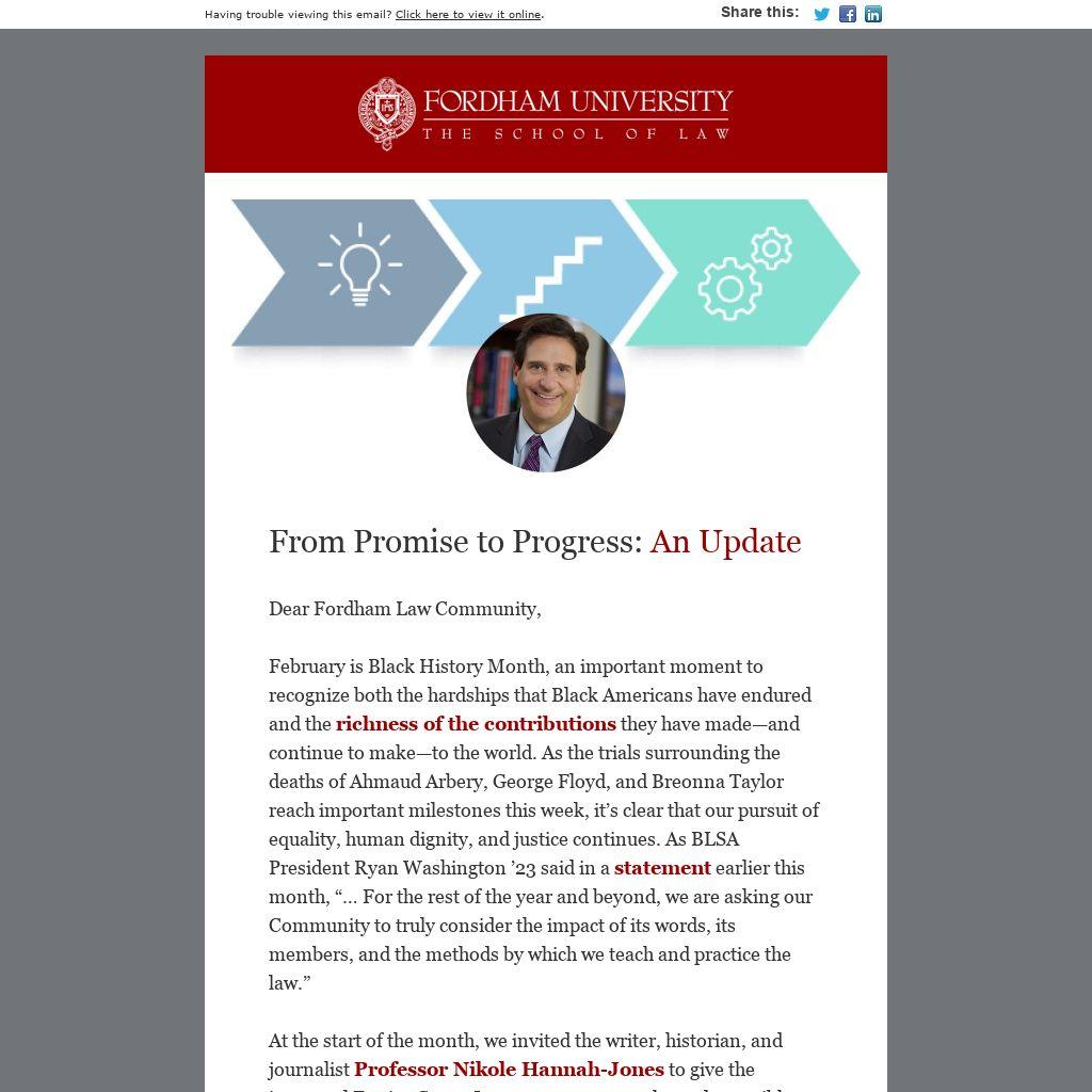 While we can celebrate all we have achieved thus far, we know that our work to fulfill the promise of equal justice is not yet complete. We look forward to continuing our efforts to further develop Fordham Law School as a place of belonging that all students, staff, and faculty can truly think of as theirs, and maintain our optimism that we can do our part to build a society that is racially just, equitable, and inclusive.