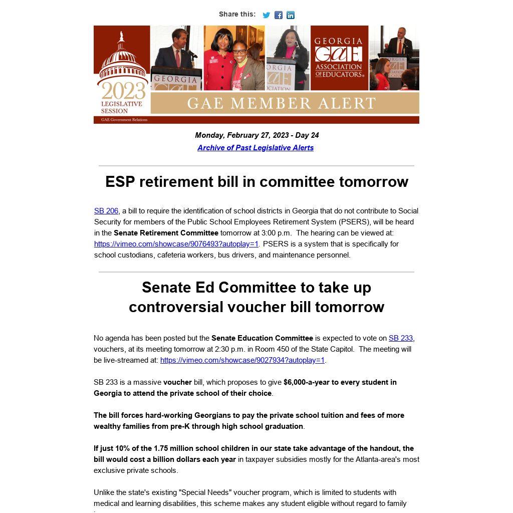 We expect the Senate Education Committee to pass SB 233 and our chance to defeat this legislation will be on the floor of the Senate. A call to action is forthcoming. It is urgent that you respond quickly once you receive this communication.