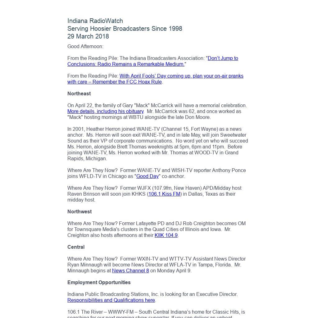 Indiana RadioWatch subscriptions are free. To subscribe, send an e-mail to irw@well.com and we'll add you. After publication, we archive Indiana RadioWatch on the Indiana Radio Archive at http://www.indianaradio.net. Please e-mail us your news stories and employment opportunities.