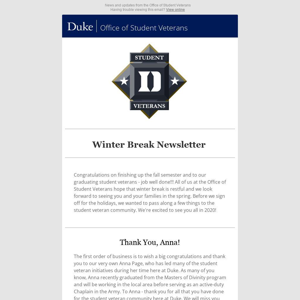The first order of business is to wish a big congratulations and thank you to our very own Anna Page, who has led many of the student veteran initiatives during her time here at Duke. As many of you know, Anna recently graduated from the Masters of Divinity program and will be working in the local area before serving as an active-duty Chaplain in the Army. To Anna - thank you for all that you have done for the student veteran community here at Duke. We will miss you and hope that you stay connected. Fair winds and following seas in your future endeavors!