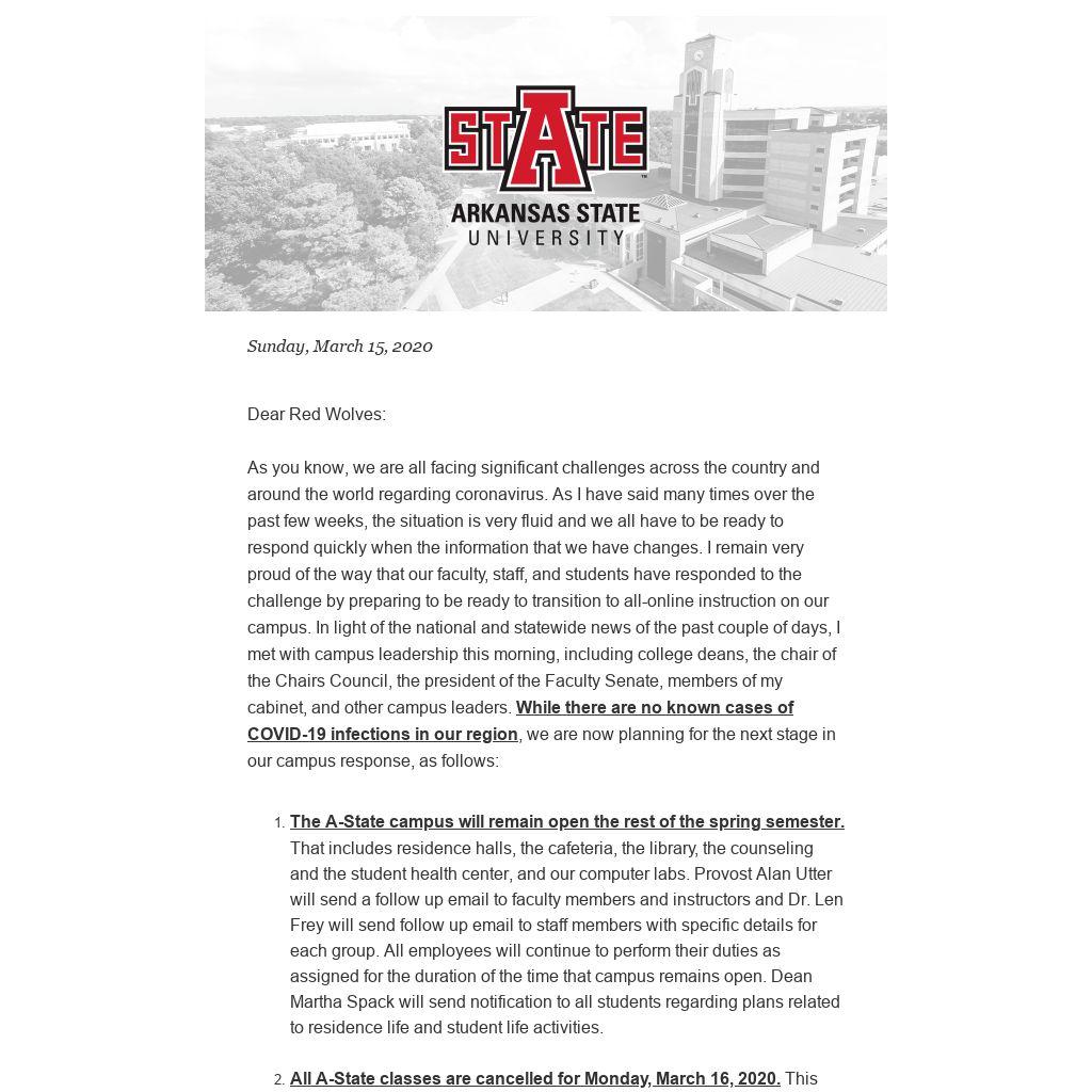 I understand that some students may wish to return home during this period of all-online instruction. That is perfectly acceptable, but to reiterate, the residence halls, cafeteria, computer labs and the rest of campus will remain open so that students will be able to keep up with their studies. Because the campus remains open, there will be no refunds for room and board.