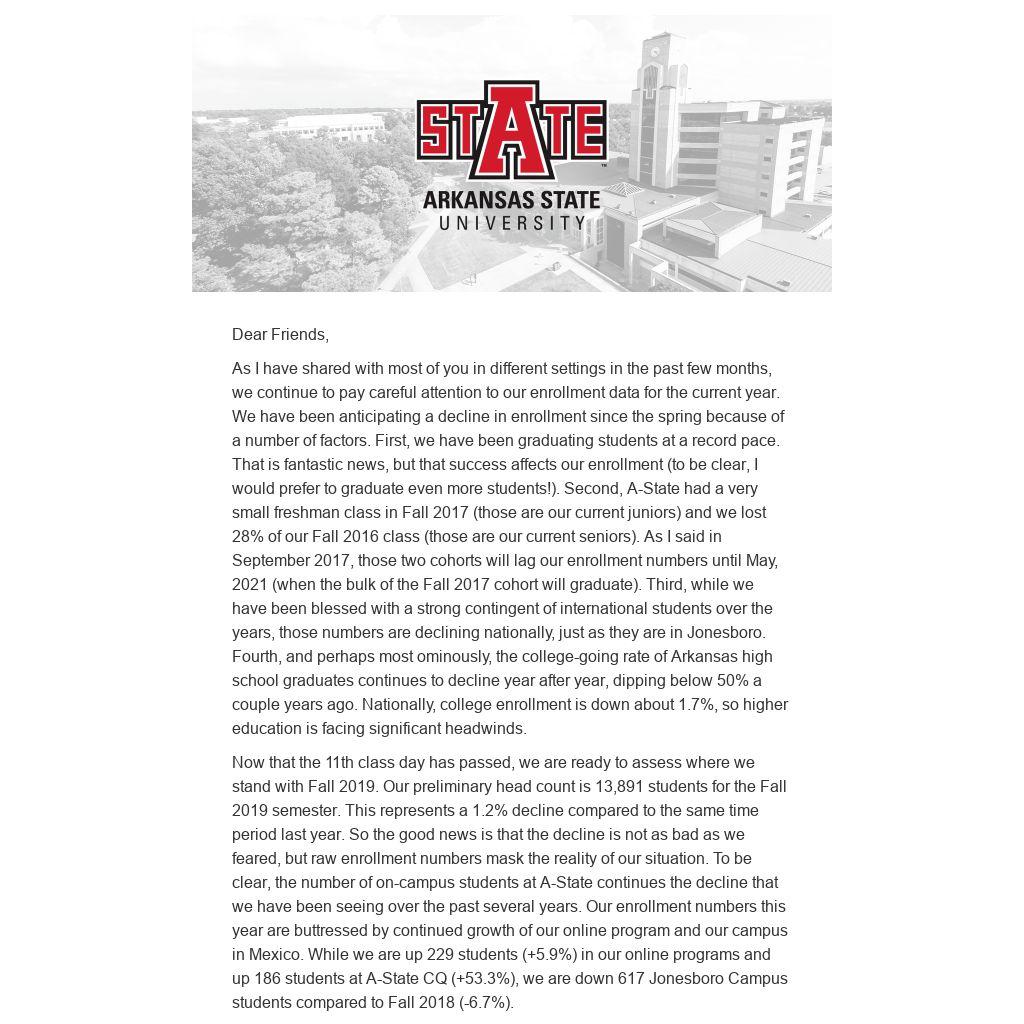 Now that the 11th class day has passed, we are ready to assess where we stand with Fall 2019. Our preliminary head count is 13,891 students for the Fall 2019 semester. This represents a 1.2% decline compared to the same time period last year. So the good news is that the decline is not as bad as we feared, but raw enrollment numbers mask the reality of our situation. To be clear, the number of on-campus students at A-State continues the decline that we have been seeing over the past several years. Our enrollment numbers this year are buttressed by continued growth of our online program and our campus in Mexico. While we are up 229 students (+5.9%) in our online programs and up 186 students at A-State CQ (+53.3%), we are down 617 Jonesboro Campus students compared to Fall 2018 (-6.7%).