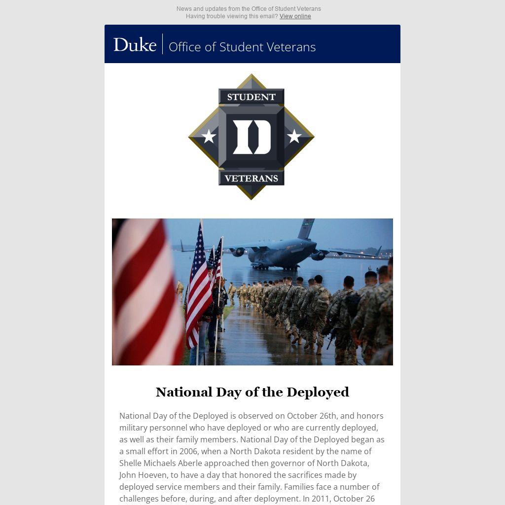 Please join the Office of Student Veterans to take a moment to remember, honor and thank our Duke community members who have deployed or who are currently deployed. We encourage you to connect personally by reaching out to each other and family members today.