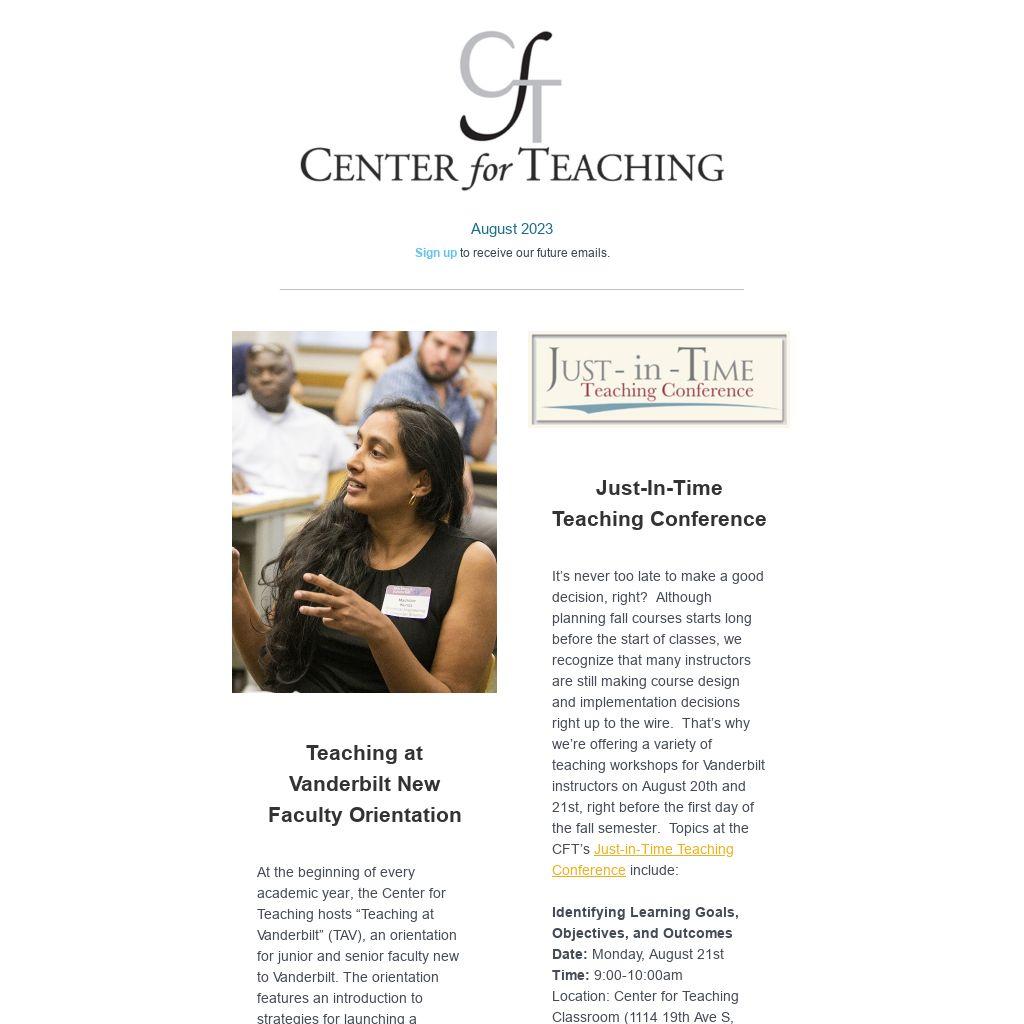 At the beginning of every academic year, the Center for Teaching hosts “Teaching at Vanderbilt” (TAV), an orientation for junior and senior faculty new to Vanderbilt. The orientation features an introduction to strategies for launching a successful teaching career at Vanderbilt, with concurrent sessions on a variety of practical topics. Teaching at Vanderbilt is an opportunity for new faculty to meet each other and to learn how the Center for Teaching can support them throughout their Vanderbilt careers. See the TAV orientation page for details and to register.
