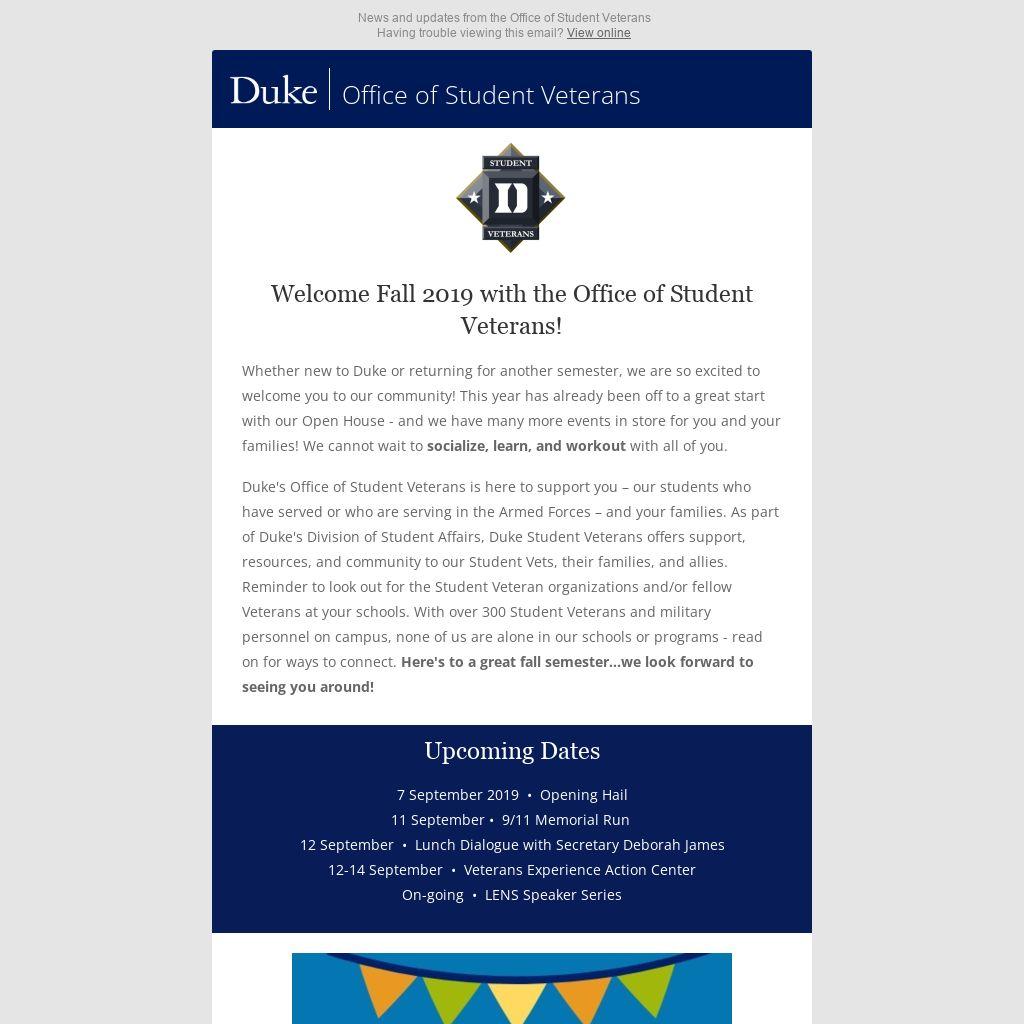 Welcome Fall 2019 with the Office of Student Veterans!Whether new to Duke or returning for another semester, we are so excited to welcome you to our community! This year has already been off to a great start with our Open House - and we have many more events in store for you and your families! We cannot wait to socialize, learn, and workout with all of you.