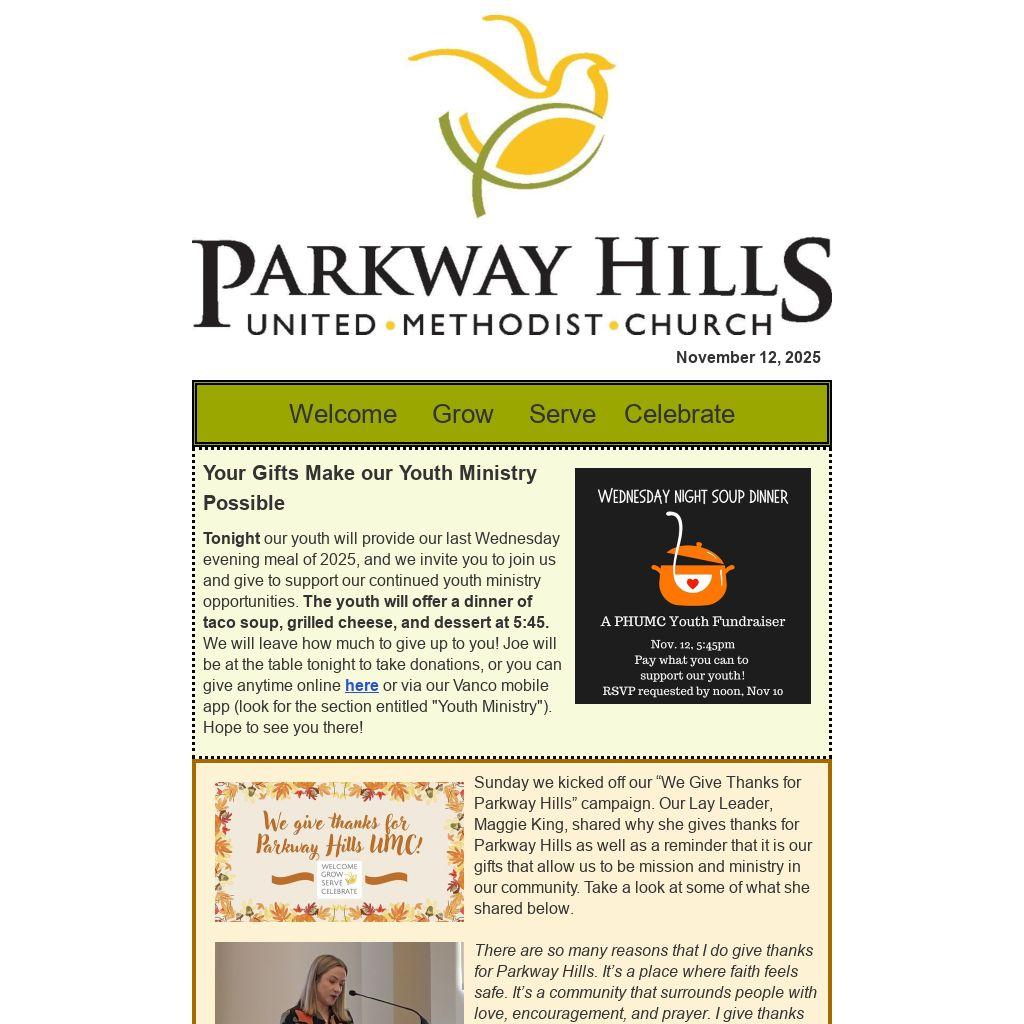 Our gifts, your gifts, make all of that possible. Every dollar, every prayer, every act of generosity helps Parkway Hills continue to be that light and that beacon of love in our community. So thank you for your faithful giving. If it has been a while since your last gift, I invite you to pray about how your giving today could help us finish 2025 strong and step into 2026 ready for all that God has planned. For the missions we’ll take on, the lives we’ll touch, and the people who will come to know His love through Parkway Hills, may we continue to be the hands and feet of Christ and give thanks for all that God is doing and will continue to do through this amazing church family.