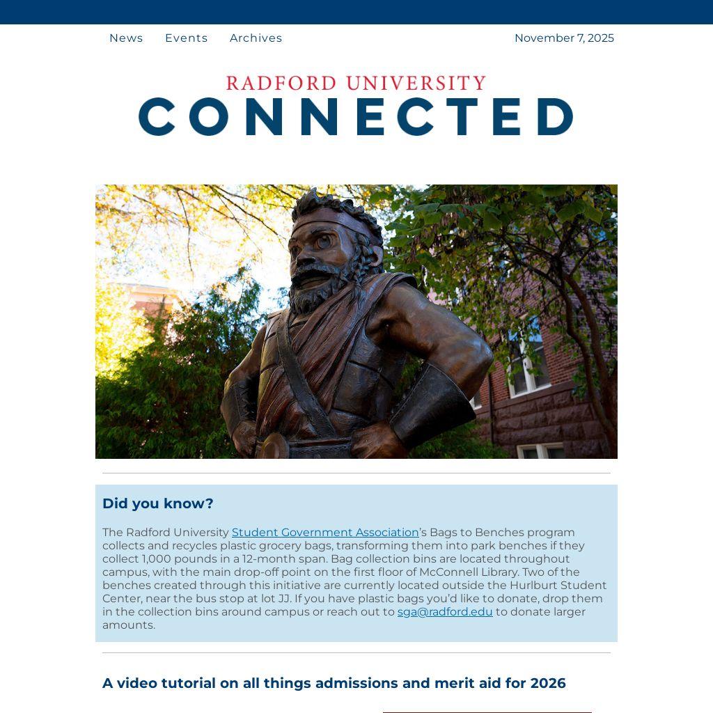 The Radford University Student Government Association’s Bags to Benches program collects and recycles plastic grocery bags, transforming them into park benches if they collect 1,000 pounds in a 12-month span. Bag collection bins are located throughout campus, with the main drop-off point on the first floor of McConnell Library. Two of the benches created through this initiative are currently located outside the Hurlburt Student Center, near the bus stop at lot JJ. If you have plastic bags you’d like to donate, drop them in the collection bins around campus or reach out to sga@radford.edu to donate larger amounts.