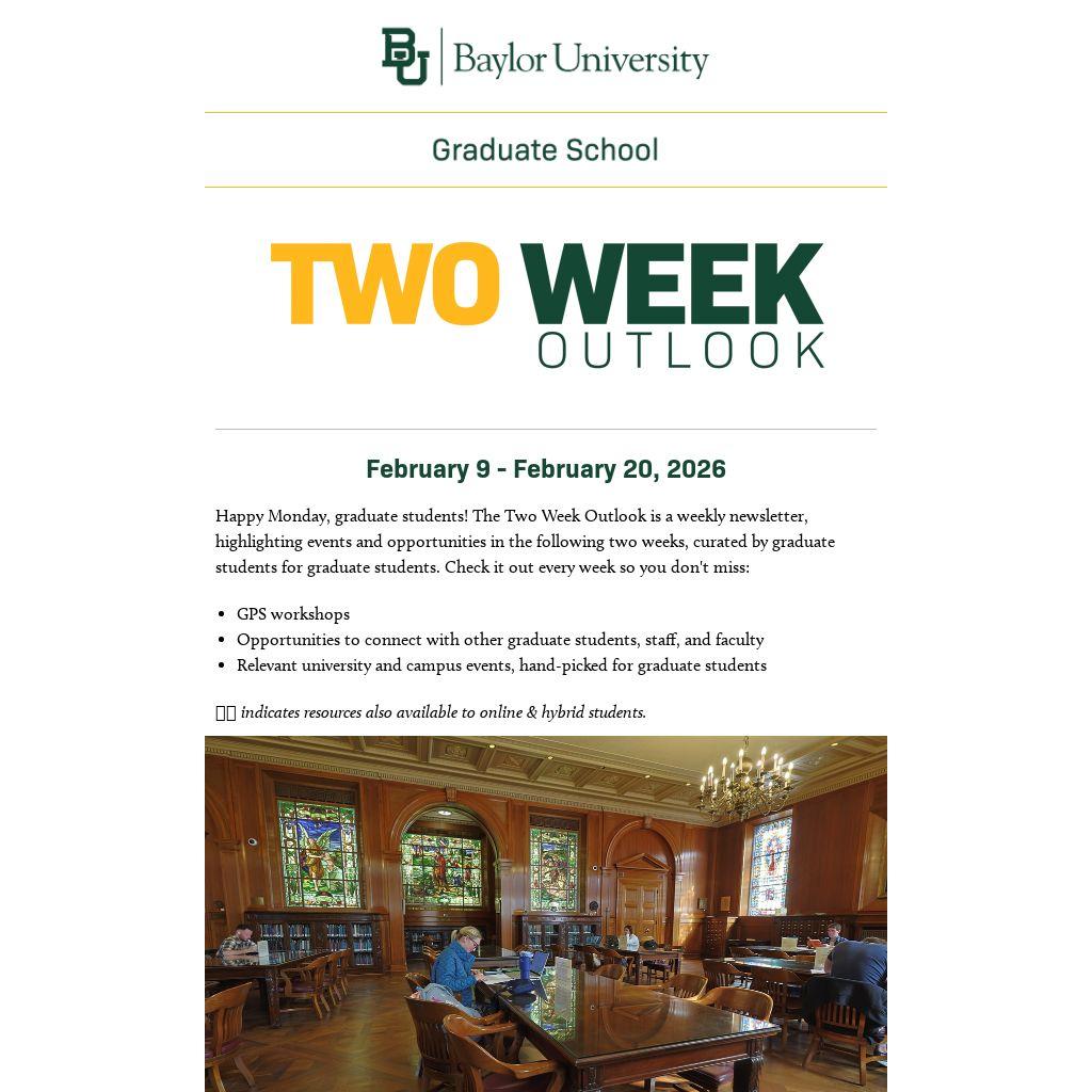 Happy Monday, graduate students! The Two Week Outlook is a weekly newsletter, highlighting events and opportunities in the following two weeks, curated by graduate students for graduate students. Check it out every week so you don't miss: