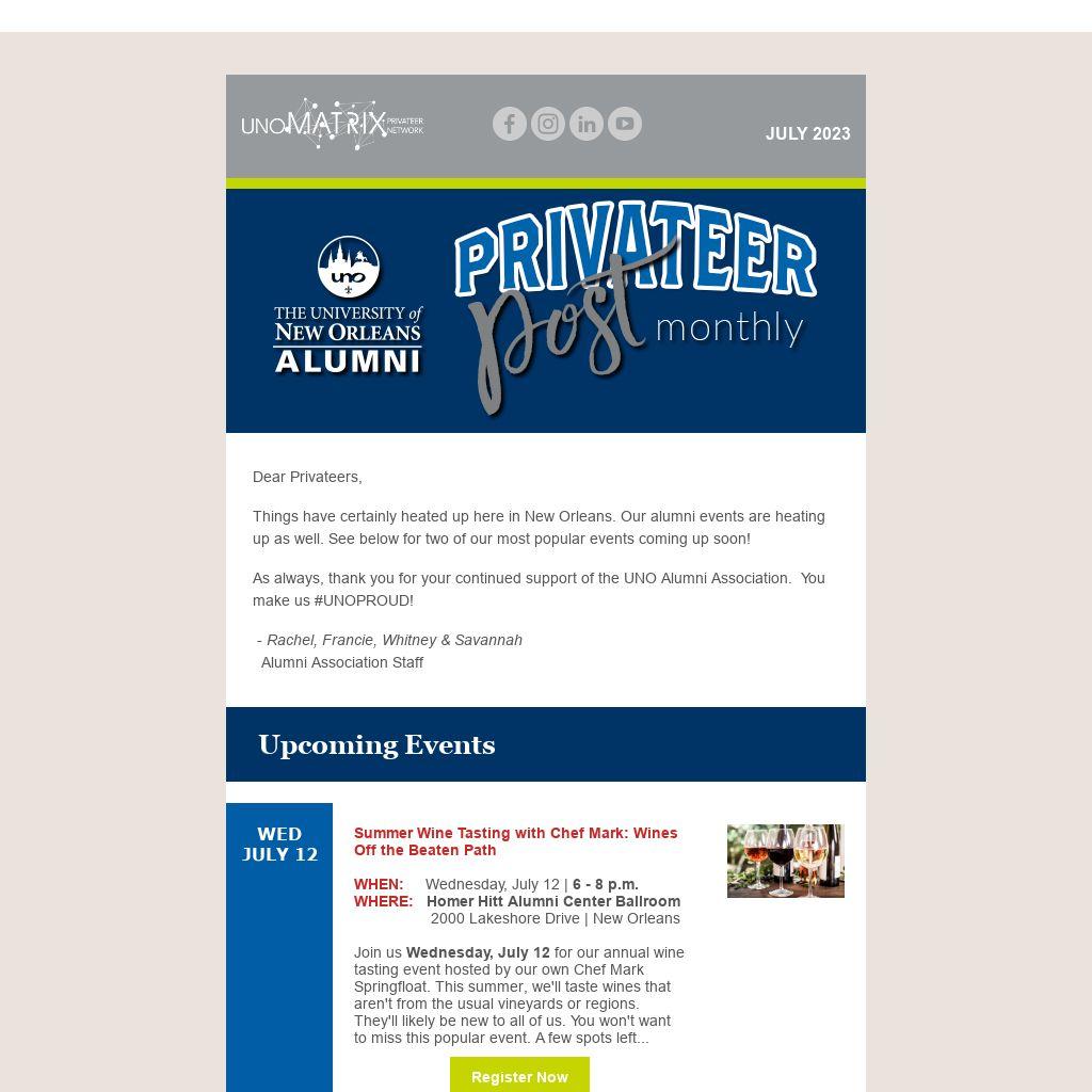 Things have certainly heated up here in New Orleans. Our alumni events are heating up as well. See below for two of our most popular events coming up soon!