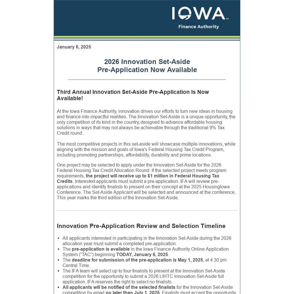 At the Iowa Finance Authority, innovation drives our efforts to turn new ideas in housing and finance into impactful realities. The Innovation Set-Aside is a unique opportunity, the only competition of its kind in the country, designed to advance affordable housing solutions in ways that may not always be achievable through the traditional 9% Tax Credit round.