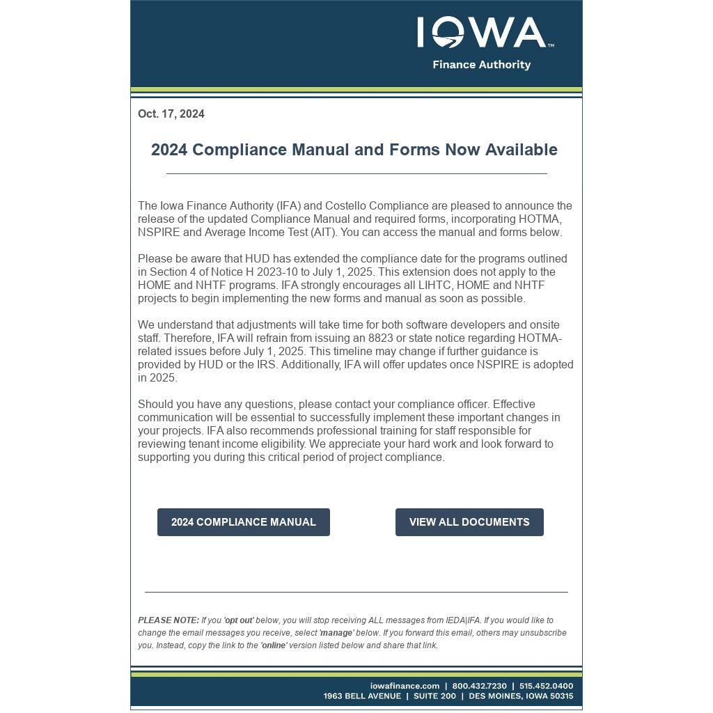 The Iowa Finance Authority (IFA) and Costello Compliance are pleased to announce the release of the updated Compliance Manual and required forms, incorporating HOTMA, NSPIRE and Average Income Test (AIT). You can access the manual and forms below.