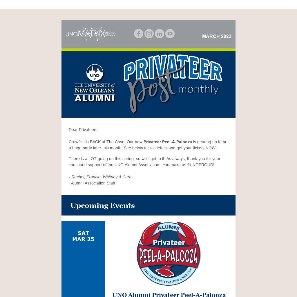There is a LOT going on this spring, so we'll get to it. As always, thank you for your continued support of the UNO Alumni Association. You make us #UNOPROUD! - Rachel, Francie, Whitney & Cara Alumni Association Staff
