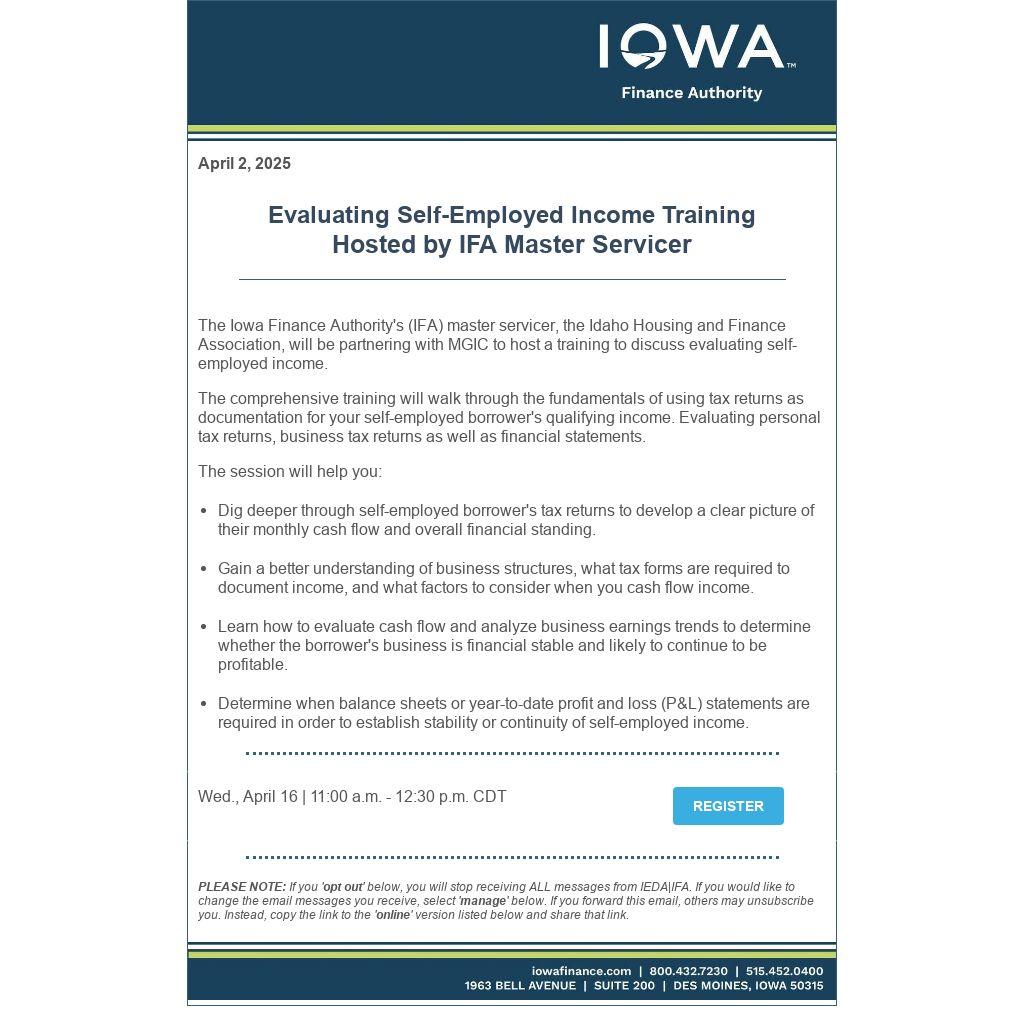 The Iowa Finance Authority's (IFA) master servicer, the Idaho Housing and Finance Association, will be partnering with MGIC to host a training to discuss evaluating self-employed income.