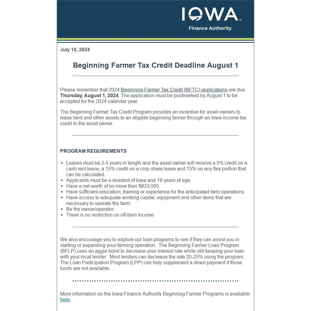 Please remember that 2024 Beginning Farmer Tax Credit (BFTC) applications are due Thursday, August 1, 2024. The application must be postmarked by August 1 to be accepted for the 2024 calendar year.