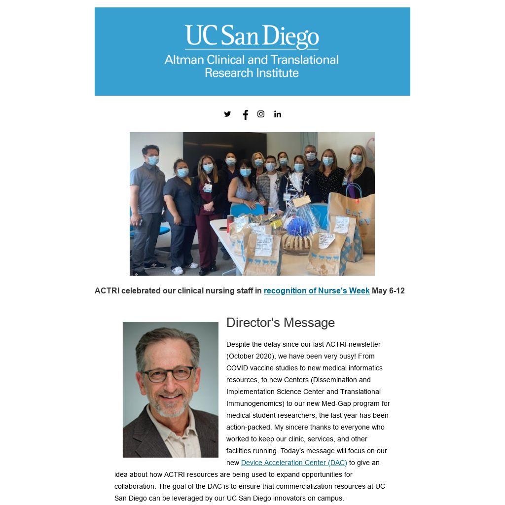Despite the delay since our last ACTRI newsletter (October 2020), we have been very busy! From COVID vaccine studies to new medical informatics resources, to new Centers (Dissemination and Implementation Science Center and Translational Immunogenomics) to our new Med-Gap program for medical student researchers, the last year has been action-packed. My sincere thanks to everyone who worked to keep our clinic, services, and other facilities running. Today’s message will focus on our new Device Acceleration Center (DAC) to give an idea about how ACTRI resources are being used to expand opportunities for collaboration. The goal of the DAC is to ensure that commercialization resources at UC San Diego can be leveraged by our UC San Diego innovators on campus.