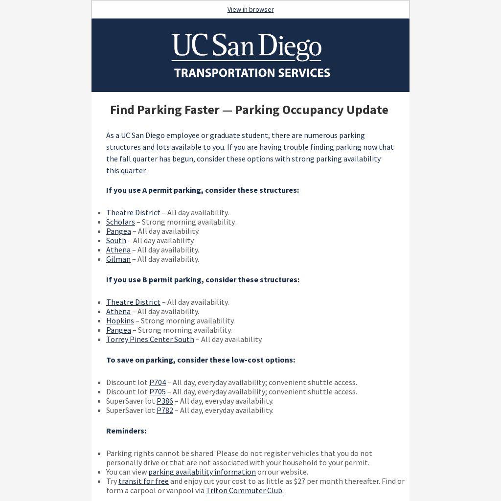 As a UC San Diego employee or graduate student, there are numerous parking structures and lots available to you. If you are having trouble finding parking now that the fall quarter has begun, consider these options with strong parking availability this quarter.
